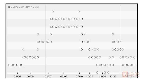 在我們使用的看盤圖表中,常見的技術(shù)圖表主要包括K線圖、柱狀圖、收盤價線圖、點數(shù)圖。據(jù)考證,股市交易者最早使用的是點數(shù)圖技術(shù)。維克托·德維利爾斯在1933年出版的《點數(shù)圖預(yù)測股價方法》一書中首次提及點數(shù)圖。點數(shù)圖中"X"形狀組成的列表示價格上升,"O"形狀組成的列表示價格下降。只需要用到最高價、最低價就可以畫出點數(shù)圖,如圖1-1所示。但是現(xiàn)在很少有人使用這一圖表,且很多看盤軟件不再提供這種看圖方法。
