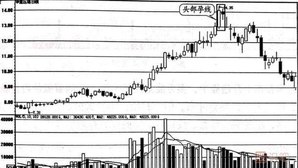 (3)凡在股價(jià)大幅上漲的位置出現(xiàn)頭部孕線(xiàn)之后,從規(guī)避風(fēng)險(xiǎn)的角度出發(fā),投資者還是減倉(cāng)操作為好,如果股價(jià)重心還在下移,就堅(jiān)決拋空離場(chǎng)。