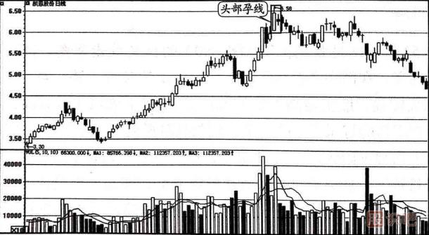 (1)頭部孕線(xiàn)最理想的量能變化是前一個(gè)交易日成交量有效放大,而后一個(gè)交易日成交量又迅速萎縮,并且如果行情繼續(xù)調(diào)整,則量能也隨之減少,這表示后市行情出現(xiàn)反轉(zhuǎn)的可能性較大。