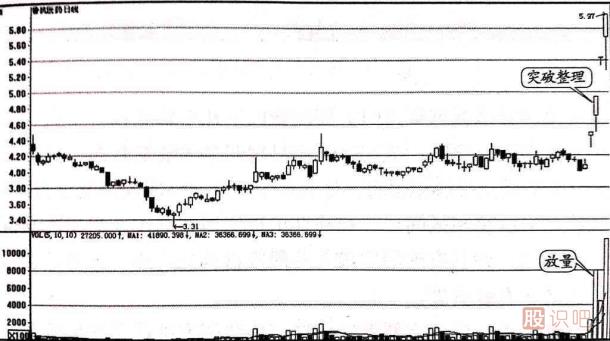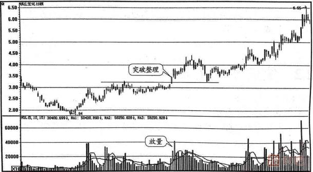 突破整理是指股價在經(jīng)過一波上漲后,在一定的上下區(qū)間內(nèi)進(jìn)行橫盤整理,突然有一天走勢圖中出現(xiàn)一根明顯放量的大陽線一舉突破整理區(qū)間高點(diǎn),形成新一波的漲勢行情,如圖1-3所示。接下來由股識吧來給您議單根K線突破整理買入,不明白的就來看看。