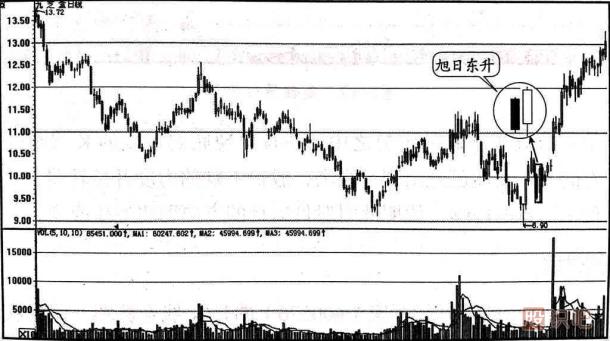 旭日東升屬于底部反轉(zhuǎn)信號(hào),下跌趨勢(shì)中股價(jià)經(jīng)過(guò)連續(xù)下挫,空頭能量已經(jīng)釋放殆盡。 在空方無(wú)力繼續(xù)打壓時(shí),多方奮起反擊,股價(jià)高開高走,前景又開始變得光明起來(lái)。 旭日東升中的陽(yáng)線實(shí)體高出陰線實(shí)體的部分越多,轉(zhuǎn)勢(shì)信號(hào)越強(qiáng),投資者看到出現(xiàn)旭日東升后,不宜繼續(xù)看空做空,而要逢低吸納。