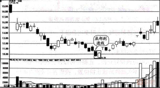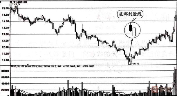 底部刺透線由兩根K線組成,第一根K線是實(shí)體較大的陰線,第二根K線跳空低開,開盤價(jià)遠(yuǎn)低于前一天的收盤價(jià),但是不久后在買盤的推動(dòng)下價(jià)格回升并且收盤價(jià)超過(guò)了第一根K線實(shí)體的一半以上,形成了一根低開高走的陽(yáng)線,如圖1-3所示。接下來(lái)由股識(shí)吧來(lái)解釋多根K線底部刺透線買入,皇天不負(fù)有心人,看完下文終于讓你知道。