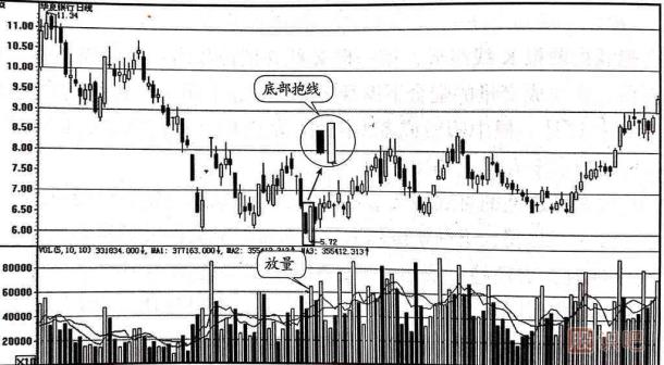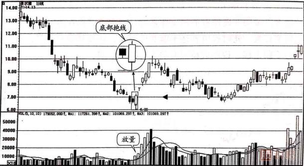 如圖1-2所示的是華夏銀行(600015)的日k線走勢(shì)圖。 該股從前期的高點(diǎn)11.34元開(kāi)始下跌,在圖中所示的方框內(nèi)第一根K線處收出一根幾乎光頭光腳的中陰線,第二天收出一根幾乎是光頭光腳的大陽(yáng)線,將第一天的中陰線完全吞沒(méi),從而形成了抱線的K線組合。 仔細(xì)分析這兩根K線,可以發(fā)現(xiàn),首先,這個(gè)抱線出現(xiàn)在股價(jià)的大幅下跌50%之后,然后,中陰線和大陽(yáng)線的實(shí)體的長(zhǎng)度相差雖然不是非常懸殊,但是第二根大陽(yáng)線處的成交量已經(jīng)開(kāi)始放大。 綜合分析可以得出多方主力已經(jīng)開(kāi)始發(fā)動(dòng)行情的結(jié)論,所以,投資者應(yīng)及時(shí)買入股票,后面會(huì)有一輪上升行情。