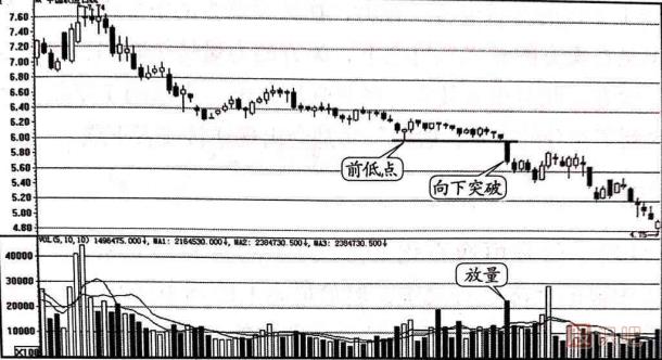 前低跌破賣出是指股價(jià)在經(jīng)過(guò)一波下跌后出現(xiàn)了不同程度的反彈,當(dāng)反彈結(jié)束,股價(jià)再次以中、大陰線突破反彈前股價(jià)的低點(diǎn),隨后將形成一波主跌走勢(shì),當(dāng)出現(xiàn)這樣的陰線時(shí),投資者應(yīng)及時(shí)跟隨主力賣出股票,如圖1-15所示。接下來(lái)由股識(shí)吧來(lái)提醒您單根K線前低跌破賣出,不明白的來(lái)掌握下。