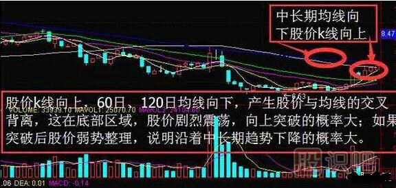 均線與均線之間的背離是正常的股價(jià)短期性波動(dòng)造成,是一種周期均線之間的運(yùn)行方向的相互背離現(xiàn)象,常見(jiàn)有短期均線與中期均線出現(xiàn)背離現(xiàn)象,比如:5日、10日兩條均線是向下運(yùn)行,而20日、30日均線卻是向上運(yùn)行,中間則是60日和120日均線卻平走。這說(shuō)明短線股價(jià)在向下打壓,拉動(dòng)了5日、10日兩條均線向下運(yùn)行,但該股整體上中期均線卻在逐步向上轉(zhuǎn)強(qiáng),因此,20日、30日均線在向上運(yùn)行。60日和120日均線對(duì)向下運(yùn)行的5日、10日兩條均線有支撐作用,而對(duì)20日和30日向上運(yùn)行的均線是一種壓制作用。那么,一旦20日、30日均線穿上突破60日和120日均線的壓制,就是中期行情來(lái)臨的信號(hào)。隨后5日、10日兩條均線也將從向下轉(zhuǎn)為向上運(yùn)行。