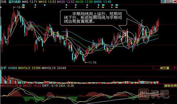 均線背離現(xiàn)象在實(shí)際抄做中經(jīng)常能夠遇到,所謂均線背離是指一是當(dāng)股價(jià)下跌見(jiàn)底后,從底部上漲時(shí),此時(shí)中長(zhǎng)期均線的運(yùn)行方向一般都是向下的,當(dāng)股價(jià)突破一條均線以后,股價(jià)的運(yùn)行方向與所突破均線的方向是“交叉”并相反;或者另一種情況是指當(dāng)股價(jià)上漲見(jiàn)頂后,快速下跌的過(guò)程中,此時(shí)的中長(zhǎng)期均線的運(yùn)行方向仍然向上,而股價(jià)快速擊穿一條中長(zhǎng)期均線后,股價(jià)方向向下,而被擊穿的均線方向確是向上的,股價(jià)與被擊穿的均線方向也是“交叉”并相反,這就是均線背離。