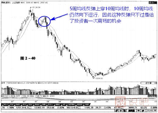 觀察圖2一39,當5周均線向下拐頭并下穿10周均線時,形成了死亡交又,死亡交叉的出現(xiàn)表明行情已經(jīng)形成逆轉(zhuǎn),下降趨勢形成。雖然從圖中我們看到股指在反彈時5周均線又回到10周均線之上,但這種反彈并沒改變10周均線的運行方向。10周均線繼續(xù)向下移動,因此這種反彈很快結(jié)束,股價繼續(xù)向下跌落,對于投資者來說,如能利用這次反彈離場便可逃脫被深套的命運。見圖2一40。
