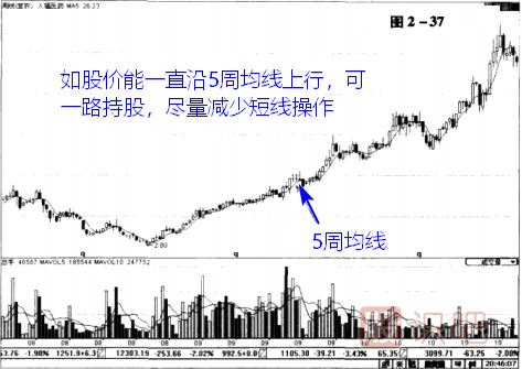 觀察圖2一37,,當股指進入新的上升趨勢后,此股也跟隨著大盤指數(shù)見底回升,進入新的上升趨勢。當股價站穩(wěn)5周均線之上后,在上漲途中雖然股價沒有大的波動,一直以小陰小陽的方式交替上行,但股價卻極少出現(xiàn)跌破5周均線的情況。即便有過跌破但很快又重新返回5周均線之上。因此我們判斷該股的主力是以5周均線作為他們的操作依據(jù)。此時投資者便應跟著主力一路持股做多,盡量減少短線操作,以免被主力趕下車。