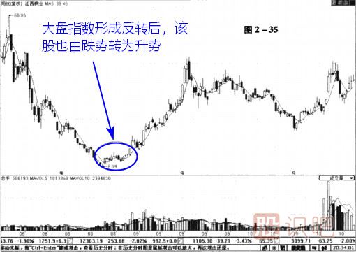觀察圖2一34,當大盤指數(shù)從6000點見頂后,股指直跌至1664點才出現(xiàn)企穩(wěn)跡象。當周K線圖中股指以大陽線突破站穩(wěn)5周均線后,正式宣告跌勢終結(jié)。雖然在第一根大陽K線出現(xiàn)后股指對5周均線多次回踩,但都沒能跌破大陽K線的開盤價,而5周均線也由原來的下跌趨勢逐漸轉(zhuǎn)為上升趨勢。這表明行情即將發(fā)生逆轉(zhuǎn),此時投資者可尋找優(yōu)質(zhì)個股擇機進入。
