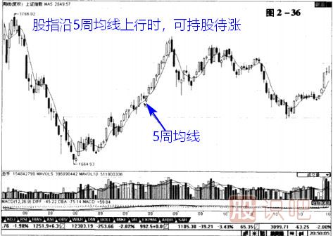 觀察圖2一36,當股指進入上升趨勢后,從1664點一直到3478點見頂都是沿5周均線上行。雖然途中有過跌破,但都能快速返回5周均線之上。面對這種趨勢投資者應以持股捂股為主(當然這種捂股不能包括所有的個股,牛市中一樣有熊股出現(xiàn),因此應該去尋找與股指走勢相似的個股進行操作),盡量減少短線操作,以免踏空行情。