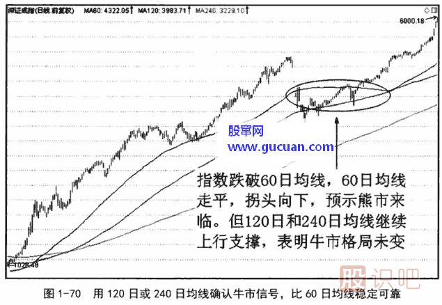 如果以120日均線或240日均線作為操作依據(jù)和交易周期,那么在指數(shù)跌破60日均線時,交易者可以減倉,也可以不減.但必須高度關(guān)注行情走勢,時刻觀察指數(shù)、120日或240日均線運(yùn)行的位置、方向和角度。