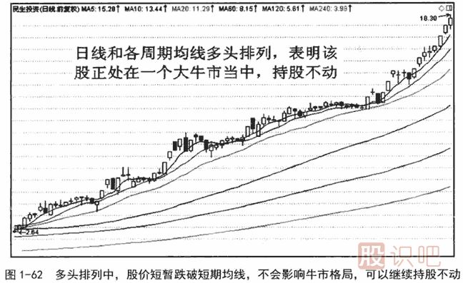 圖1-62是與圖1-61同一時間段的日線圖。該圖上有6條均線,分別為5日、10日、20日、60日、120日、240日均線。除了5日和10日均線以外,其余都是中長期均線。交易者可以觀察到,該股上漲過程中除了短期均線偶有交叉和粘合之外,中長期均線一直呈完美的多頭排列。多頭排列是非常重要的持股待漲技術(shù)形態(tài),交易者豈能輕易半途而廢?