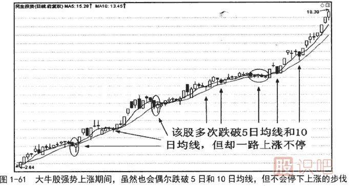 圖1-61是民生投資(000416)的日線圖。該股一直持續(xù)上漲,短時間內(nèi)漲幅接近7倍,可以稱得上大牛股了。在上漲過程中,股價基本沿著5日和10日均線上漲,中途偶爾跌破5日和10日均線。交易者如果墨守成規(guī),在跌破5日或10日均線時離場,雖不能說一定是錯,但肯定會“撿了芝麻丟了西瓜”,白白錯失后面的一段主升行情。
