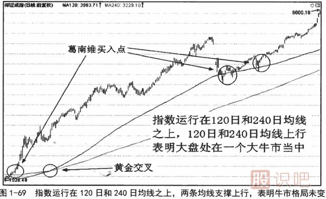 120日和240日均線主要用來判斷大盤趨勢。和60日均線一樣,通常認(rèn)為:指數(shù)運(yùn)行在120日和240日均線之下,120日和240日均線下行,是熊市;指數(shù)運(yùn)行在120日均線和240日均線之上,120日均線和240日均線上行,是牛市。與60日均線相比,120日和240日均線更加穩(wěn)定可靠,但發(fā)出的信號也更滯后。