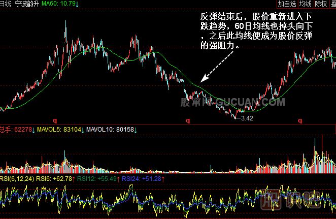 觀察圖4,從中看到,60日均線再次掉頭向下時(shí),股價(jià)一路下滑。雖然期間有所反彈,但此時(shí)的60日均線不再成為股價(jià)的支撐,而成為強(qiáng)烈的反壓,每當(dāng)股價(jià)反彈至60日均線附近時(shí)便繼續(xù)向下跌落。對(duì)于短線投資者來(lái)說(shuō),如果在下跌途中搶反彈,就要在股價(jià)反彈至60日均線附近時(shí)及時(shí)拋出;對(duì)于中長(zhǎng)線投資者來(lái)說(shuō),應(yīng)繼續(xù)場(chǎng)外觀望。