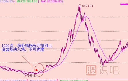 A股經(jīng)過暴跌之旅,2005年11月份,大盤趨勢(shì)線拐頭開始向上,此時(shí)大盤大約1160點(diǎn),此時(shí)投資者可以果斷入場,不要有任何猶豫。后市行情最高發(fā)展到6124點(diǎn)。