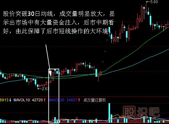 從圖中可以看出,該股在左側(cè)走勢中始終處于30日均線的下方,由此顯示了市場中期弱勢向下的特點,所以不具備短線操作的大環(huán)境。當(dāng)創(chuàng)出5.33元的新低之后,該股緩慢上漲,之后該股強勢放量突破了30日均線的壓制,股價中期趨勢得到改變,短線操作的大環(huán)境開始形成,如下圖所示: