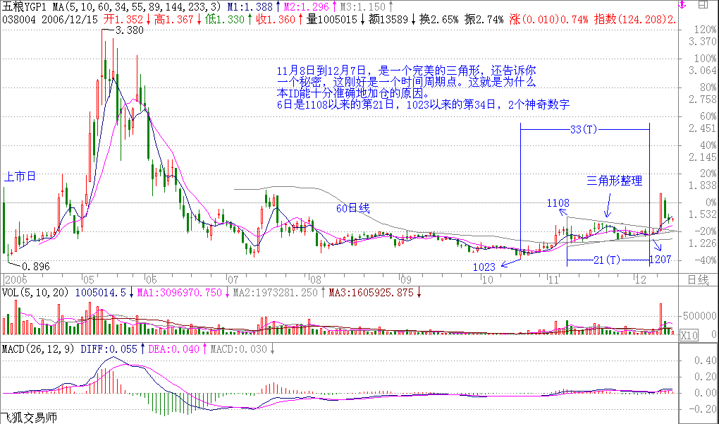 關(guān)于038004的作業(yè),回答比較正確的是下面這位。但還是有點(diǎn)出入。10月23到25日是本ID的見倉期,第一波上去后,11月8日減了一半,后來在60天線附近一路回補(bǔ),加倉是在12月6日、7日兩天,比第一次買的,加了1/2的倉位。這里的理由除了第二類買點(diǎn),還有一個現(xiàn)在沒說到的,就是三角形整理的第五波末段。該走勢十分標(biāo)準(zhǔn),自己去研究一下。昨天根據(jù)5分鐘線的背弛出了大半,把剩下的成本是0了。本ID作權(quán)證,特別是認(rèn)沽,第一輪上去都會這樣減倉操作,只持有成本是0的倉位等待第二波,第二波是否有,這已經(jīng)問題不大了,這樣就絕對立于不敗之地了。