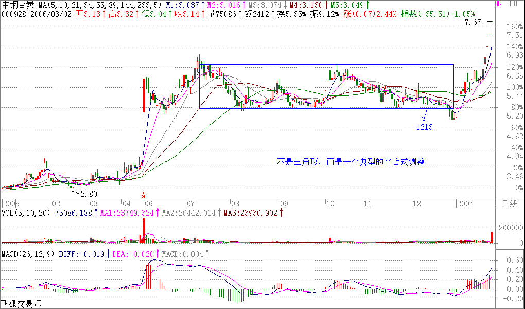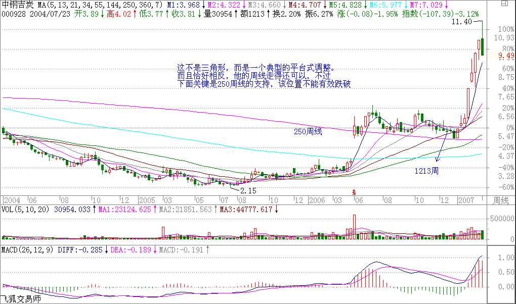這不是三角形,而是一個典型的平臺式調(diào)整。而且恰好相反,他的周線走得還可以,不過下面關(guān)鍵是250周線的支持,該位置不能有效跌破。