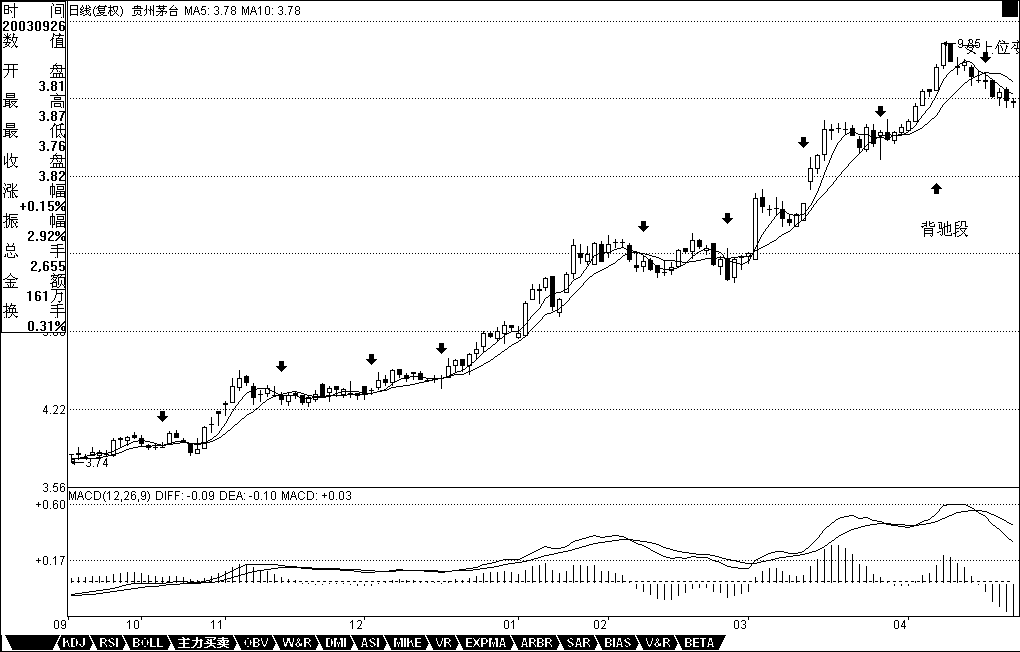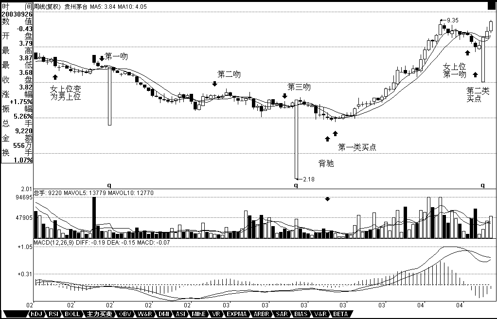 現(xiàn)在,先打開茅臺的周線圖,在茅臺快6年的周線圖上,用5周與10周均線構(gòu)成的買賣系統(tǒng),只有第一類和第二類買點各一個,可見,在周線圖上,按均線系統(tǒng)構(gòu)成的買點并不常見,一旦出現(xiàn)必須珍惜。仔細分析:2002年4月19日那周,茅臺進入男上位,其后在2002年7月9日那周進入男上位的第一吻,前面已經(jīng)說過,這第一吻后的下跌一般不會構(gòu)成買點,必須是至少第二吻以后。其第二吻出現(xiàn)在2003年2月14日那周,是典型的濕溫,其后在下跌并沒構(gòu)成背馳,不符合第一類買入點的原則。然后在2003年6月27日那周構(gòu)成第三吻,是一個不太強烈的濕吻,其后的下跌就出現(xiàn)了明顯的背馳走勢,在MACD圖上,綠柱子比上一次的明顯縮短,而低位卻低于上次綠柱子出現(xiàn)時的低位。如何判斷背馳走勢結(jié)束,最簡單的就是當(dāng)綠柱子縮短,而股價繼續(xù)創(chuàng)新低,這次,明顯地發(fā)生在2003年9月26日這一周,意味著底部出現(xiàn),第一類買點構(gòu)造完成,可以大舉介入了。