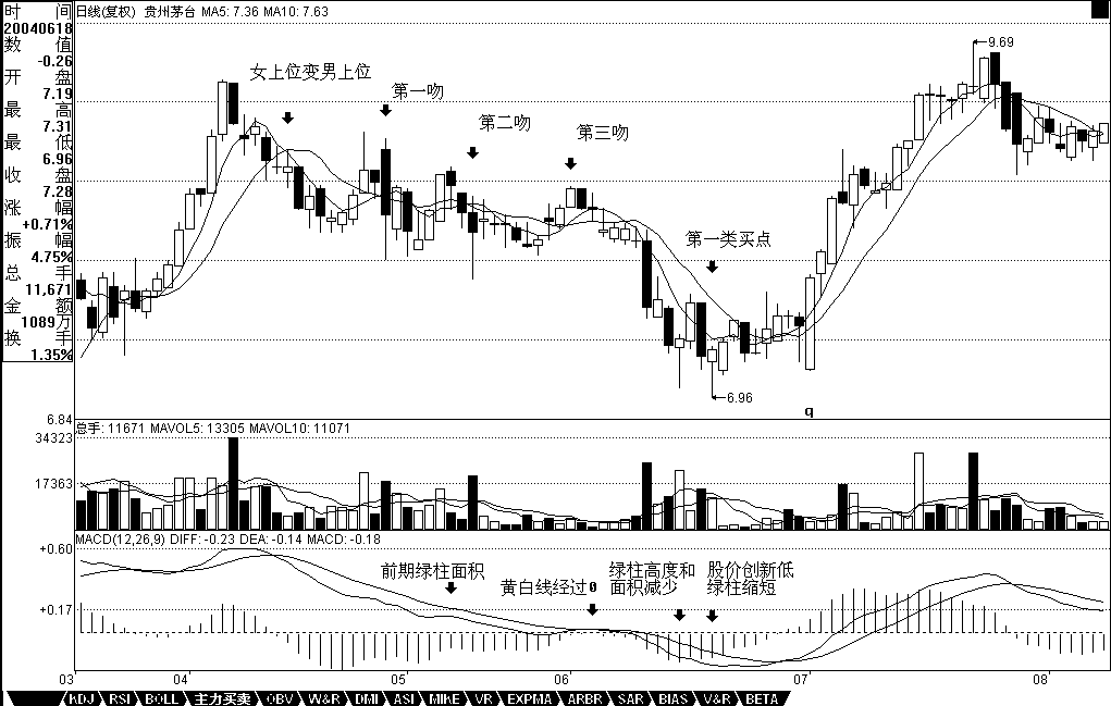 對于茅臺,2004年6月4日那周出現(xiàn)女上位后第一吻,對應(yīng)在日線圖上是明顯的男上位走勢,該走勢其中出現(xiàn)三次吻,分別在2004年4月29日、5月18日、6月1日,都是典型的濕吻,但前兩次其后的下跌都沒有出現(xiàn)背馳,只有第三次,出現(xiàn)明顯的背馳性走勢,6月18日創(chuàng)下低點后,MACD的綠柱子明顯比前面的要縮短,這就構(gòu)成了日線上的第一類買點,而這個買點,在周線上就是第二類買點。注意,后面由于除權(quán),價位上似乎比這個要低了,其實并沒有。